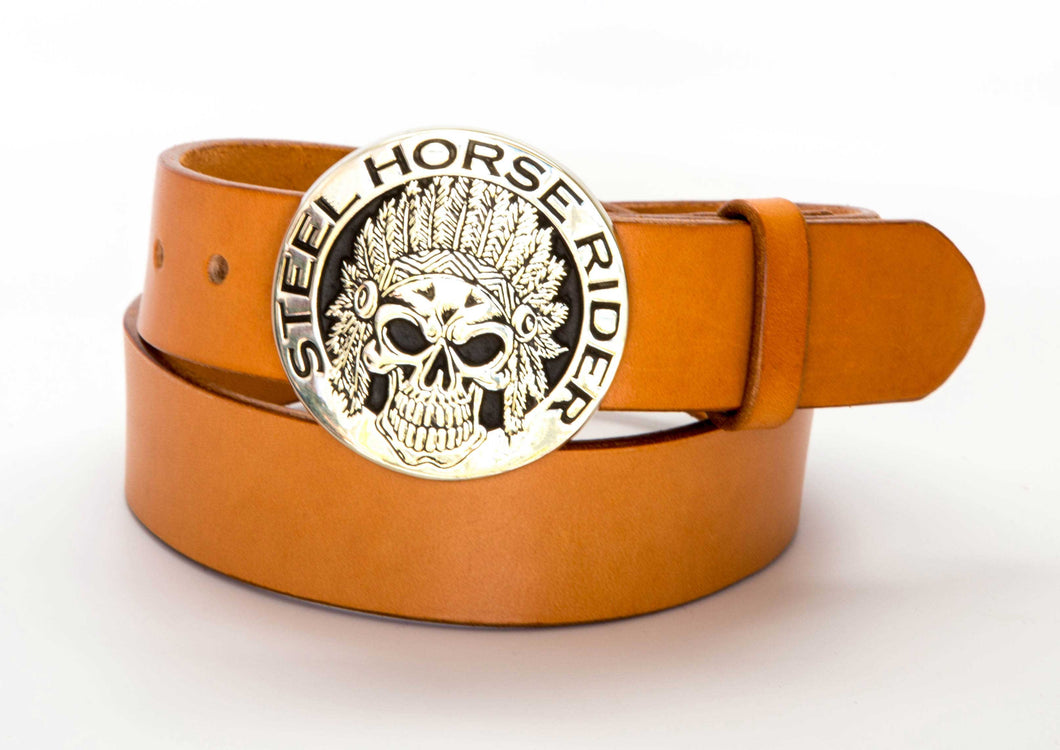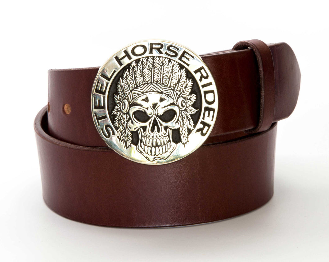 - Bridle leather belt with sand-cast solid silver bronze Indian Headdress Skull - Steel Horse Rider buckle