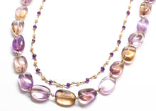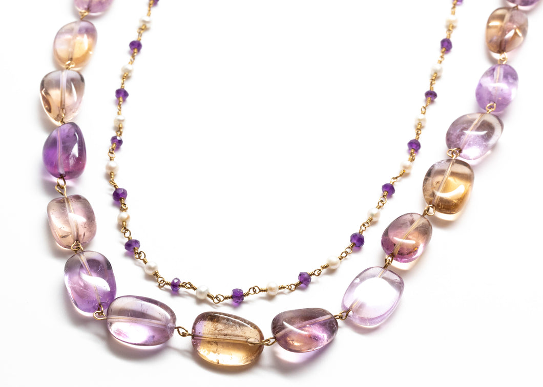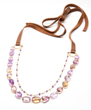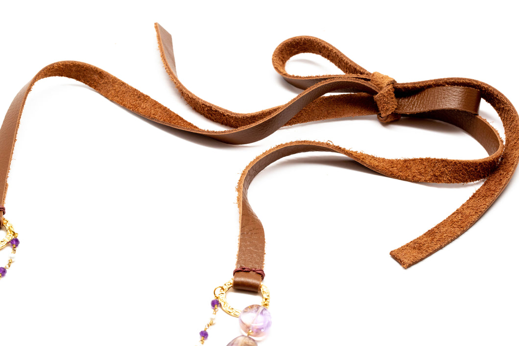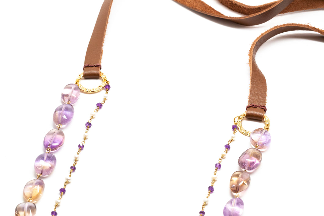 - This gorgeous Ametrine, white Freshwater Pearl, and Amethyst necklace has 24k gold overlay hardware and saddle brown leather ties.