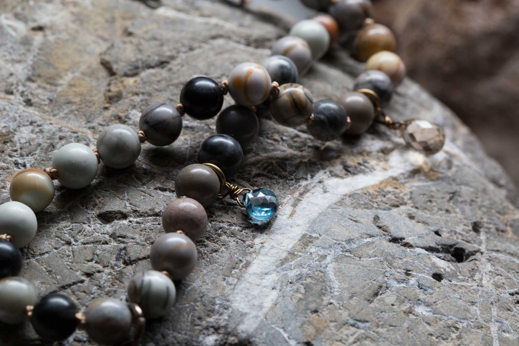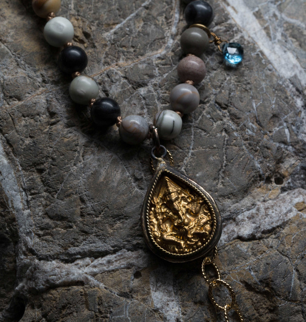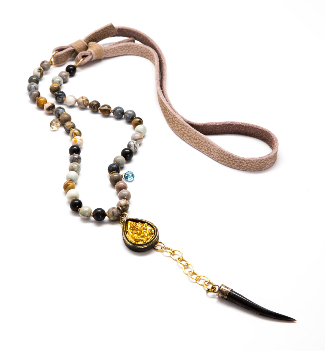• 38" Necklace: Picasso jasper and leather necklace with London blue topaz and smoky quartz embellishments. Finished with an antique brass Ganesha pendant and a hand-carved bone claw drop.