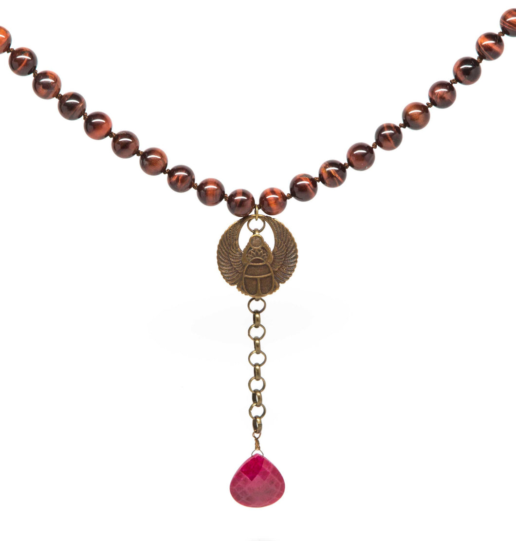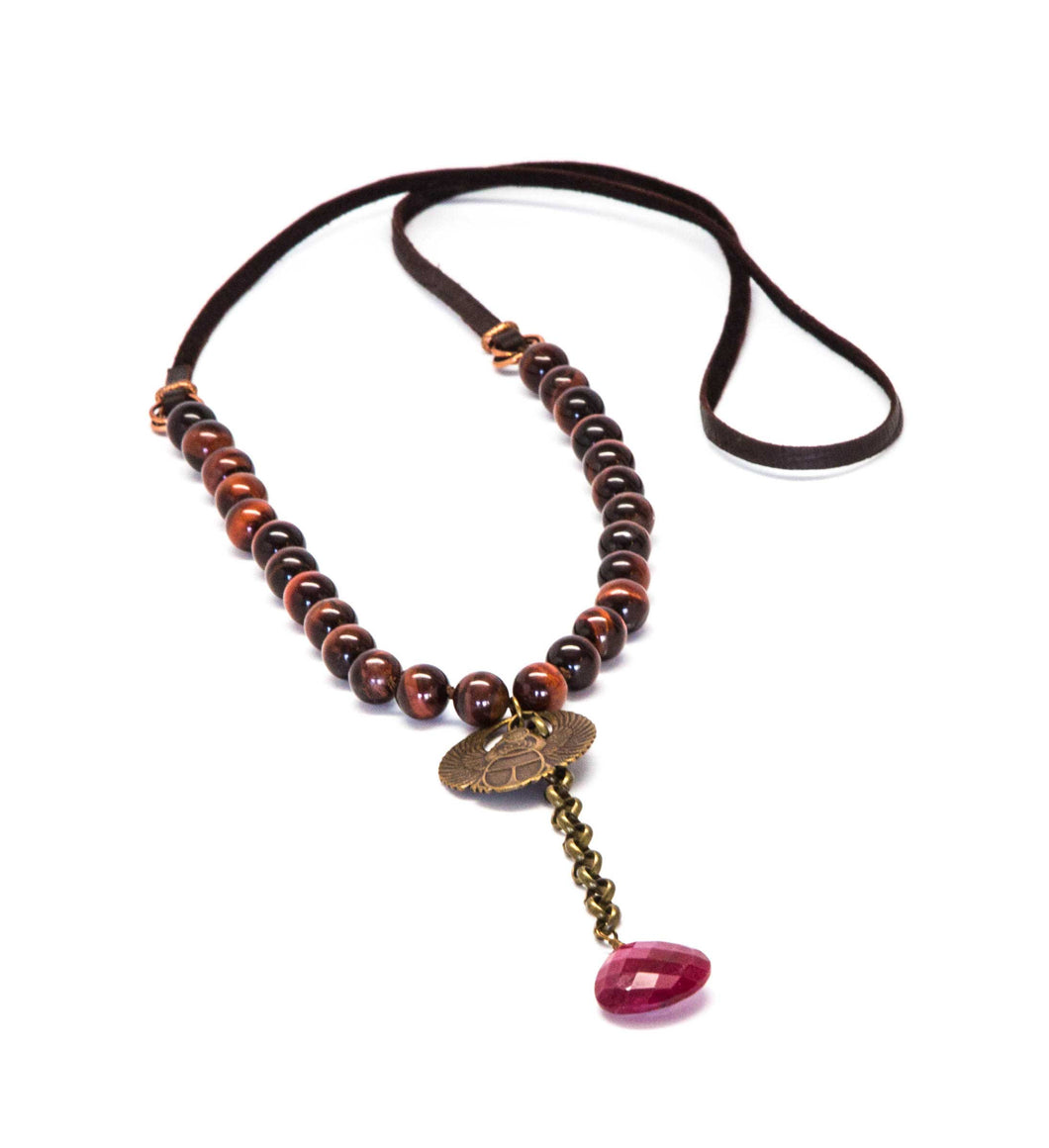 • Red Tiger's Eye and brown leather lace necklace knotted with brown silk cord and embellished with a brass scarab and a large faceted ruby drop.