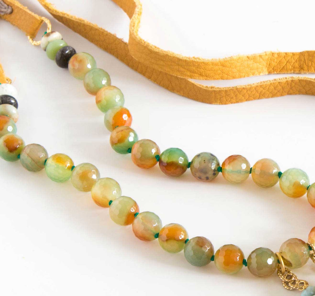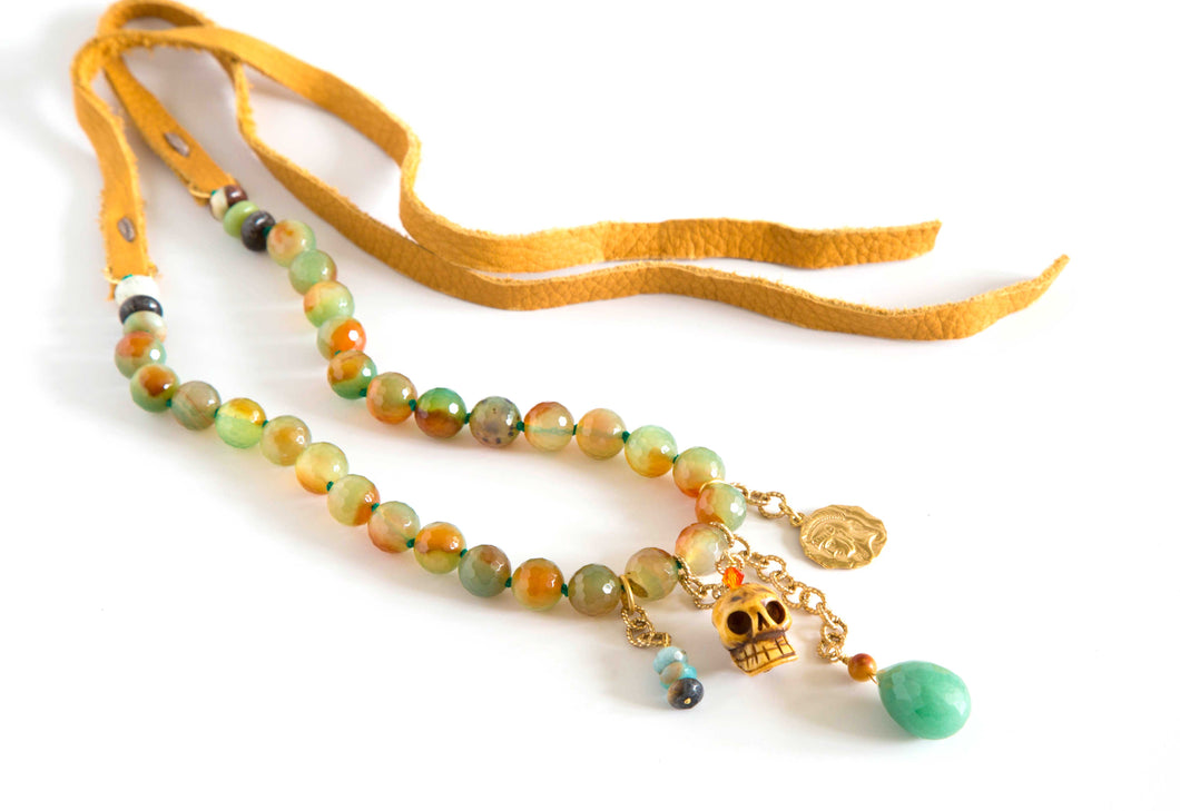 • 36" Necklace; Green/brown agate and black/gold amazonite necklace with butterscotch leather ties and gold-filled hardware. Finished with amazonite, aventurine, hand-carved bone skull and Spartan soldier coin drops.