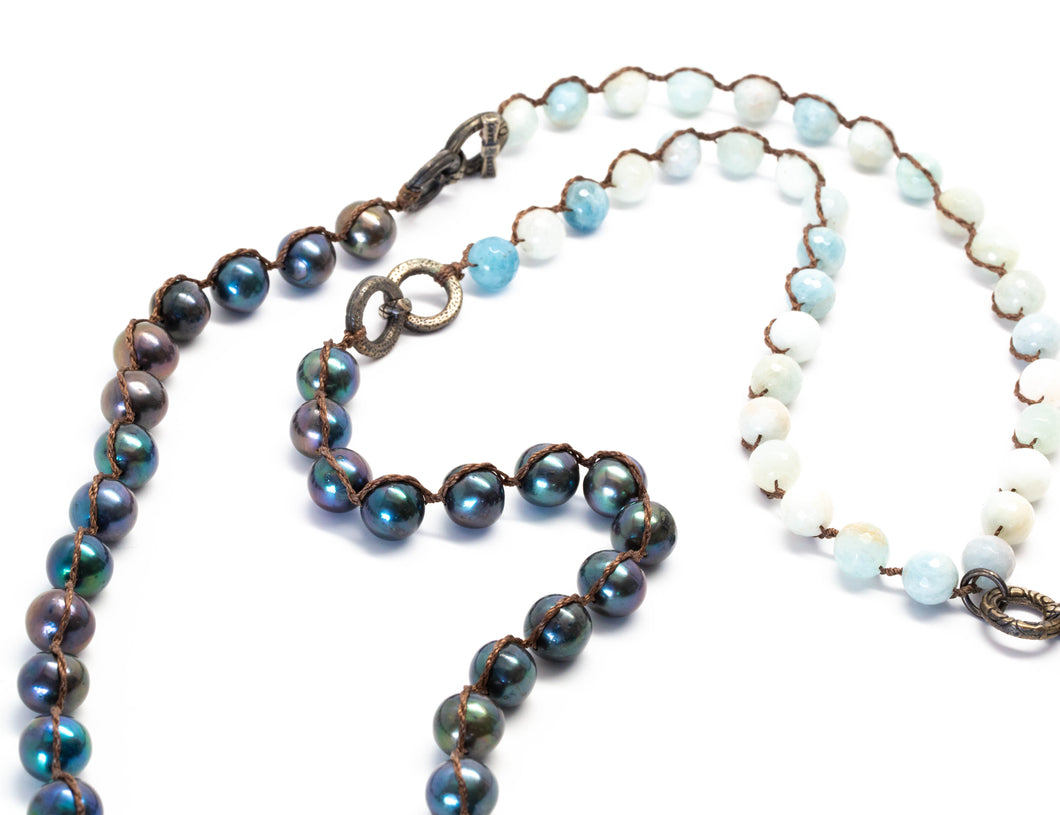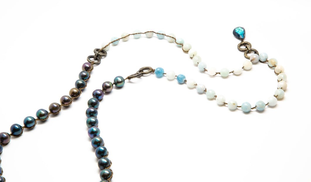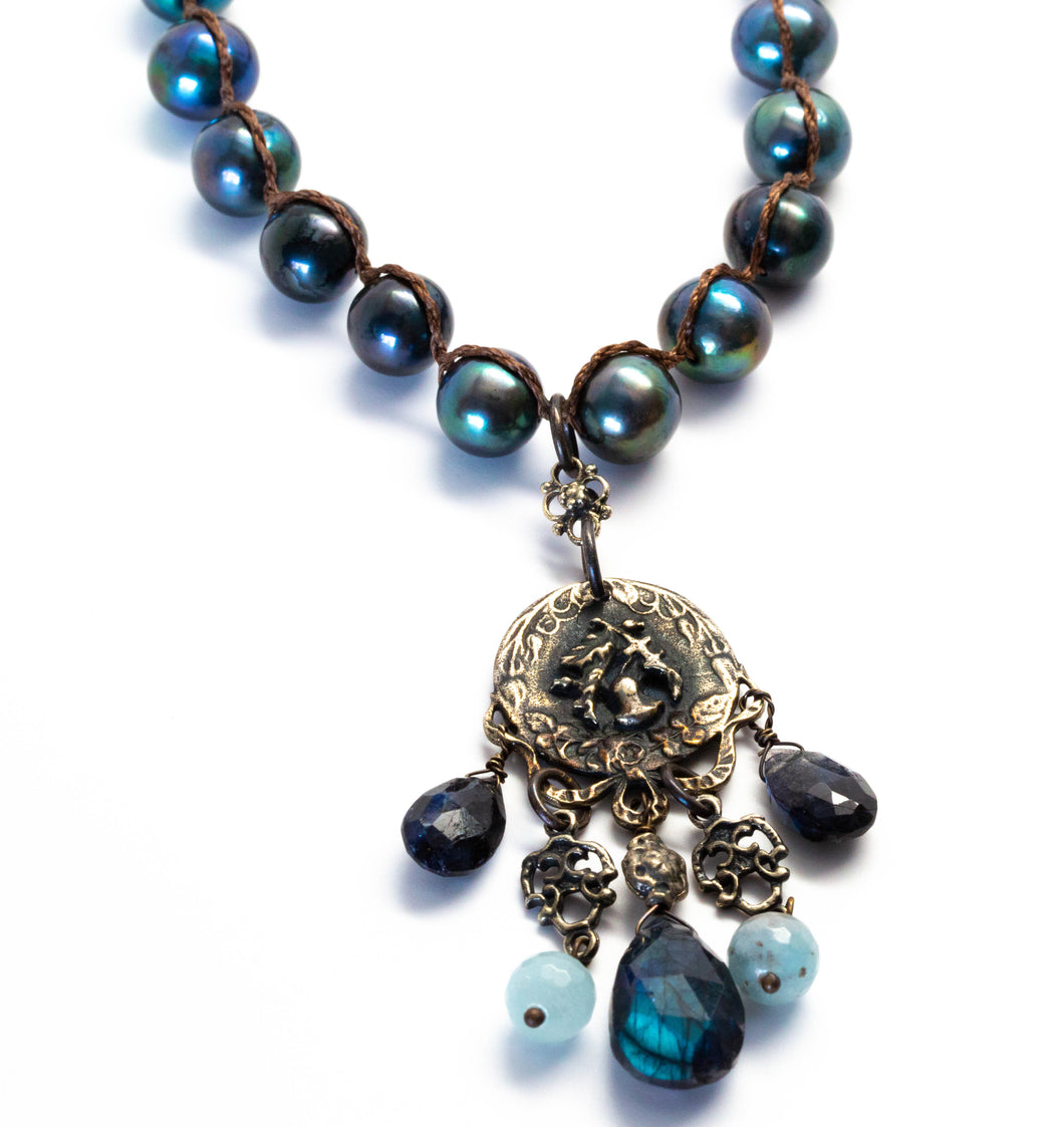 - Where the water meets the sky is where you will find this 36" necklace of braided aquamarine and freshwater peacock pearls. Finished with hand carved white old world bronze charms with blue labradorite drops.